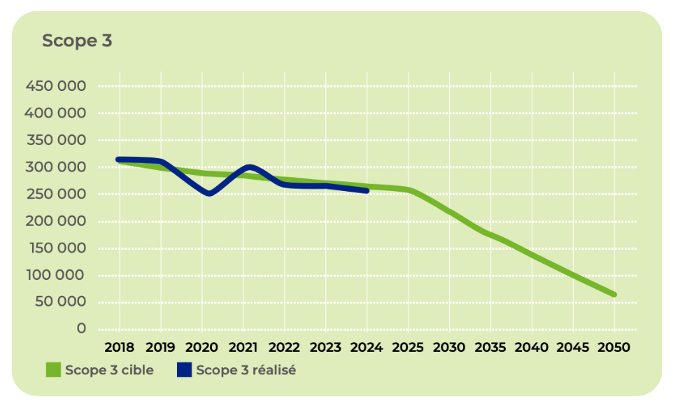 Scope 3 : Élargissement de la stratégie aux partenaires avec développement du report modal et accompagnement des sous-traitants via le Pacte de transition énergétique. La démarche inclut le renforcement de la décarbonation de l’affrètement et, dans le cadre du label RFAR, un nouvel outil d’évaluation climat pour les fournisseurs hors transport en 2025.