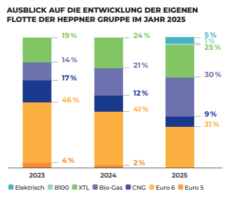 Im Rahmen seiner Energiemix-Strategie hat Heppner den Einsatz von Biokraftstoffen im Jahr 2024 deutlich erhöht. Nach der Einführung des Biokraftstoffs XTL (HVO100) im Jahr 2022 setzte der Konzern diese Umstellung fort, so dass Ende 2024 24 % der Flotte diesen Kraftstoff nutzen. Parallel dazu hat sich die Nutzung von Biogas intensiviert: Während die ersten Gasfahrzeuge 2021 zum Einsatz kamen, fährt die Hälfte von ihnen nun mit Biogas (einer erneuerbaren Version von Erdgas), welches 80 % weniger CO2 ausstößt und im Gegensatz zu Erdgas nicht fossilen Ursprungs ist, wodurch das Engagement der Gruppe für Alternativen zum Dieselkraftstoff gestärkt wird. Heppners Bestreben ist es, den Anteil von CNG zugunsten von Biogas für seine Fahrzeuge zu reduzieren.